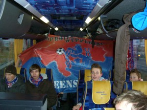 stieg meine Stimmung schlagartig an, als sich hinter uns endlich die Bustüre schloss, die Kinder alle Platz genommen hatten, Frikadellen, Brötchen, Getränke und Fahnen hinter der Gepäckklappe verstaut waren und die wohlig warme Heizungsluft meine eingefrorenen Hände auftaute.