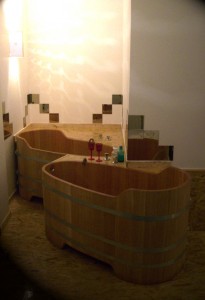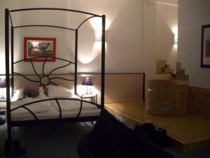 Eine Vielzahl von Künstlern hat hier bei der individuellen und kreativen Gestaltung der großzügig angelegten Hotelzimmer ihre Pinsel im Spiel gehabt. So waren wir in einer ca. 70qm großen Hochzeitssuite (1 Raum!) untergebracht. In einer Raum-Nische wurden auf einer Empore 2 Holzbadewannen stilvoll arrangiert.