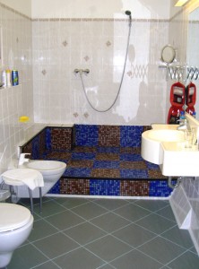 In einem separaten Zimmer lag dann das eigene Badezimmer mit einer freien Dusche (keine Türen) – ebenfalls auf einem Podest aus bunten Mosaik-Steinchen angelegt.