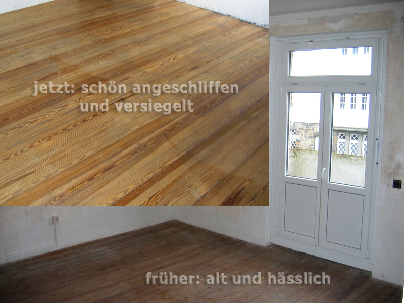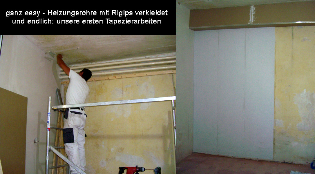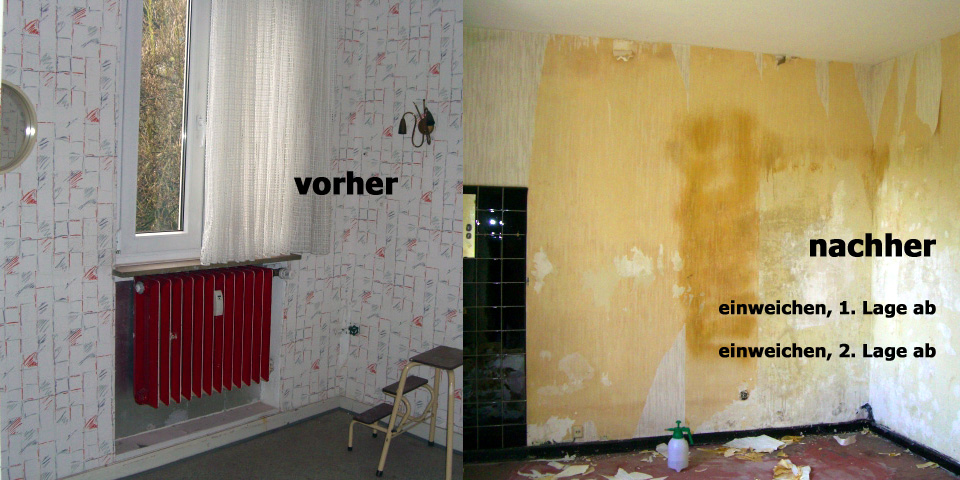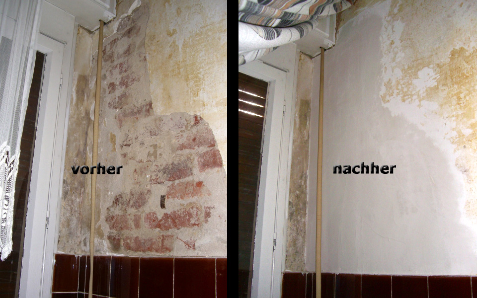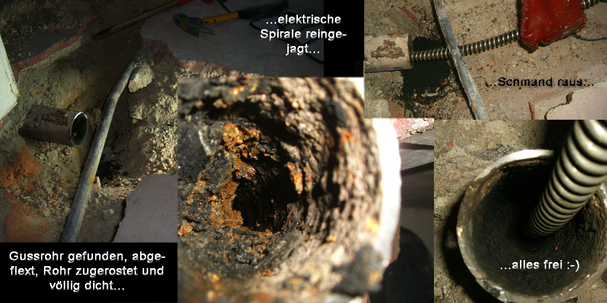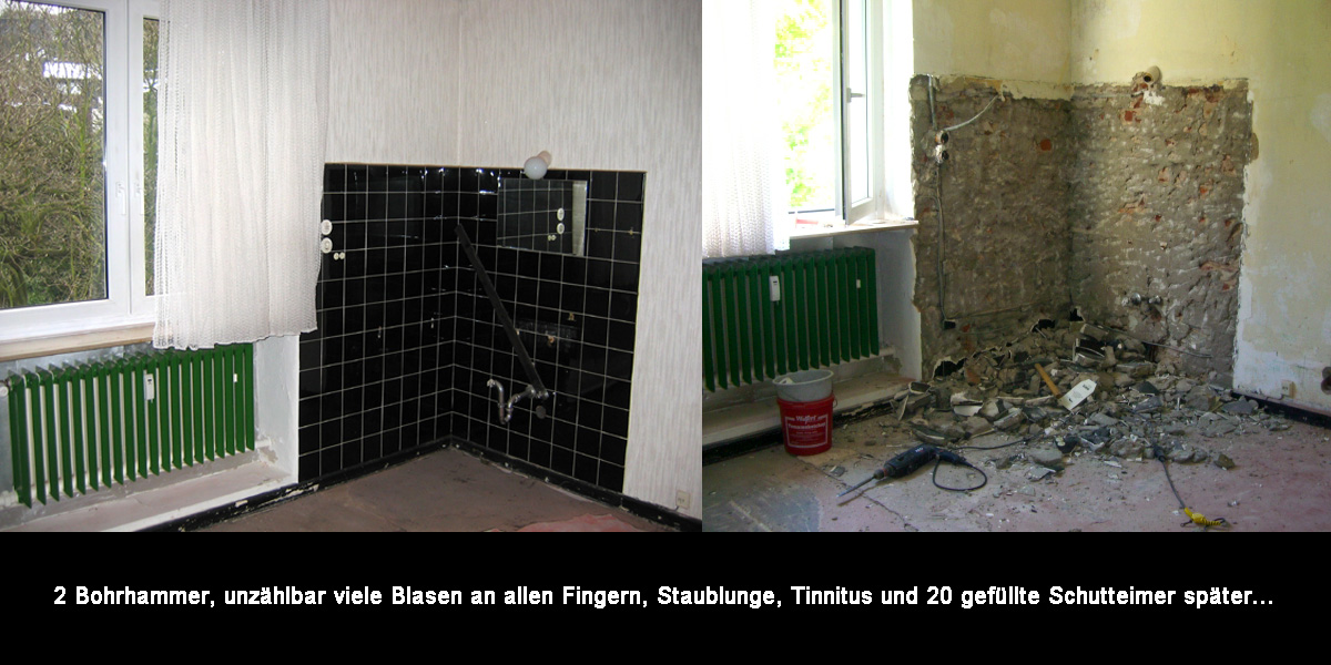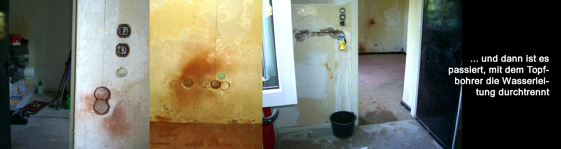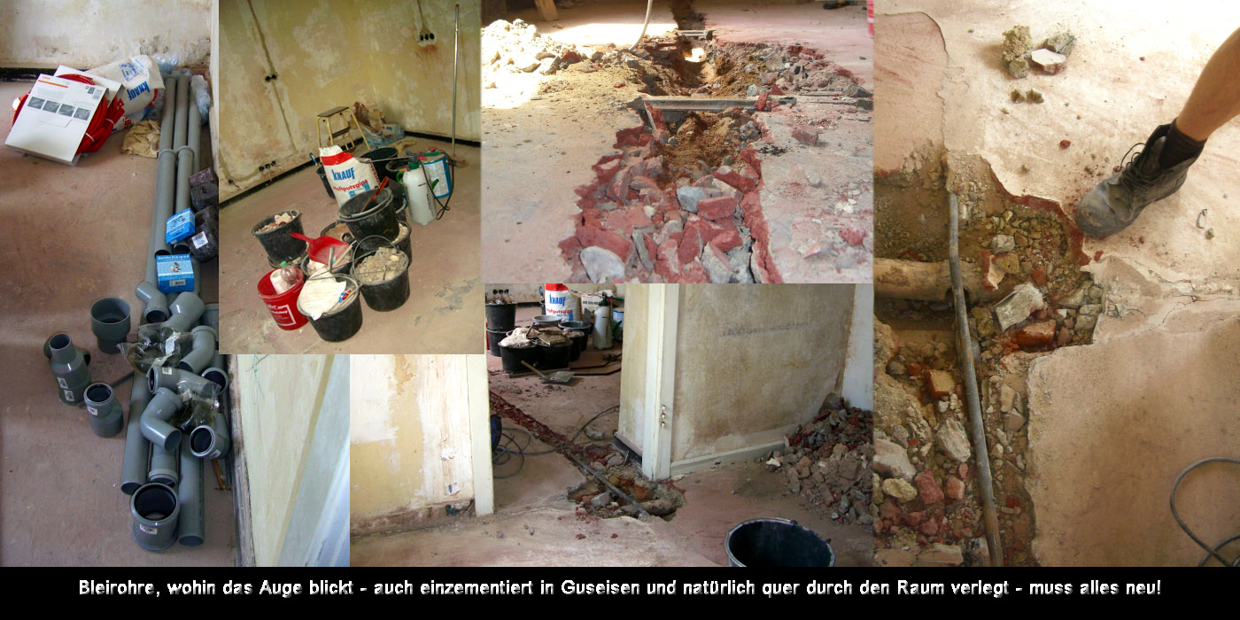 Und wieder was gelernt: Man kann also ein Bleirohr des Wasserabflusses auch in ein Gus-Rohr einzementieren. Man kann auch den Durchlauferhitzer des 1. OG an eine 50 Jahre alte stoffummantelte Stromleitung im EG anklemmen. Man kann auch über ein im Fundament eingelassenes Eisenrohr, das 2 cm aus dem Boden ragt, PVC-Boden drüber legen – dann sieht man’s nicht mehr. Und man kann ohne Probleme ein Lehrrohr von anno domini so aus der Wand ziehen, dass einem die halbe Wand entgegen kommt. Ganz prima auch, die Rolladen-Kästen zu vernageln und zu verschrauben, damit man auch auf keinen Fall an den Rolläden irgendetwas reparieren muss. Wenn man nun über alte Strombuchsen, die erst mal keiner braucht 2-fach Tapete drüber klebt, dann fällt auch gar nicht auf, dass hier keine Abdeckung vorhanden ist. Und der sich über Jahrzehnte bildende Rost schimmert ja auch nur bei starkem Lichteinfall durch. Auch ja, noch ein Tip an alle Heimwerker, die gerne ihren Wohnbereich mit PVC auslegen. Wenn sich so Ecken hoch wölben, einfach Nägel in den Boden ballern wie blöd – dat hält!