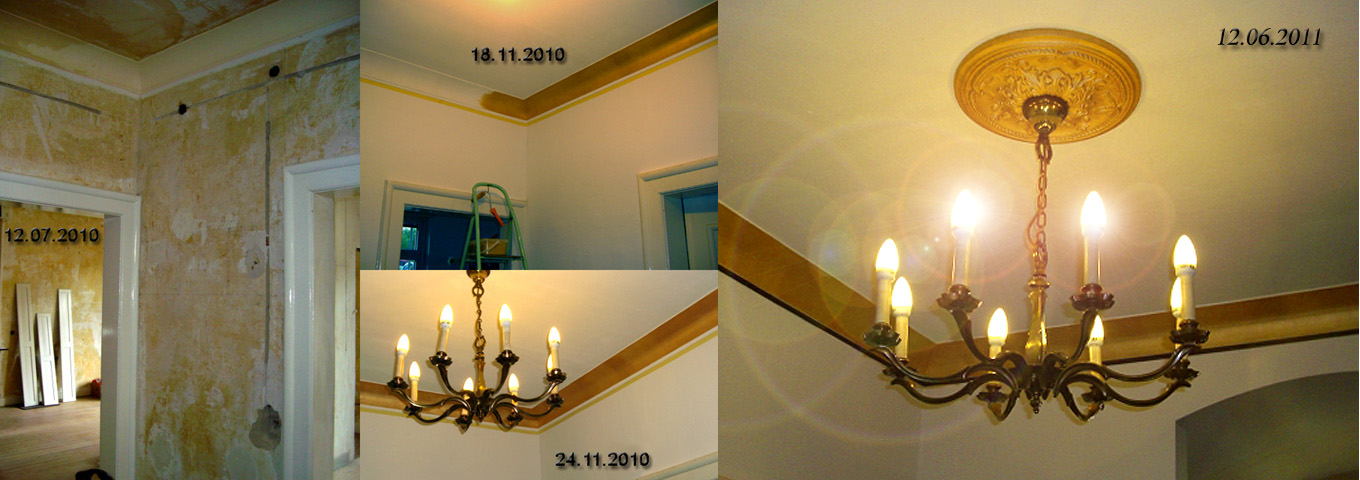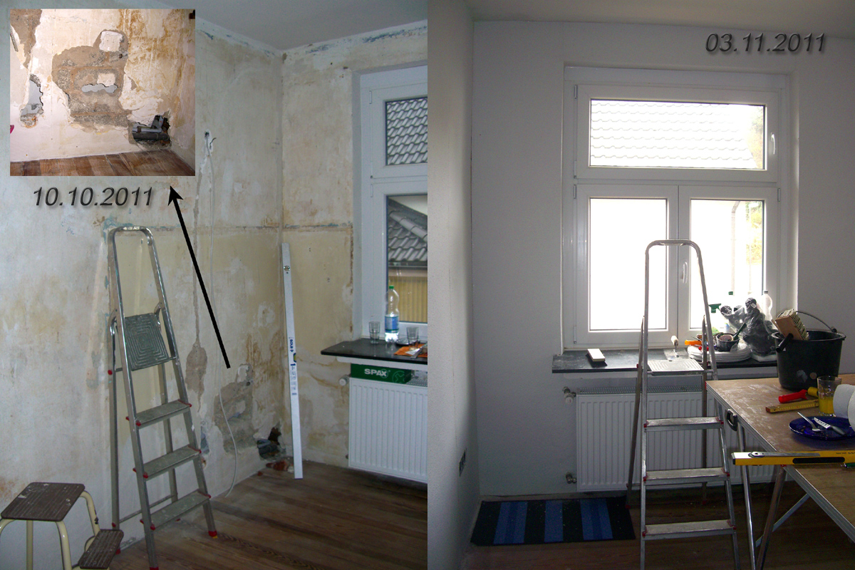 So langsam lassen die Kräfte nach – zumindest im Kopf – wenig Schlaf, viel Arbeit. Immerhin sieht man inzwischen auch mal, dass was passiert. Es riecht nach Lack, Staub und Schweiß. Der Elektriker hat einen sicheren Sicherungskasten verbaut. Der alte Kram ist weg. Eine Wasserleitung wurde beim bohren zerlegt. Morgen soll Ersatz geschaffen werden. Eine Baufolie wurde aus einer Wandecke gezogen, die nun ein Faust großes Loch ziert. Es ist schon abenteuerlich, was sich die Bewohner der Hauses in den letzten 90 Jahren gedacht/ nicht gedacht haben, wie man eine Wasserleitung oder ein Stromkabel verlegen könnte. Gelernt haben wir schon: Mit Sicherheit nicht da, wo es hin gehört und fast immer dort, wo es niemals sein darf (z.B. offene Stromkabel unter einer verbleiten Wasserleitung).