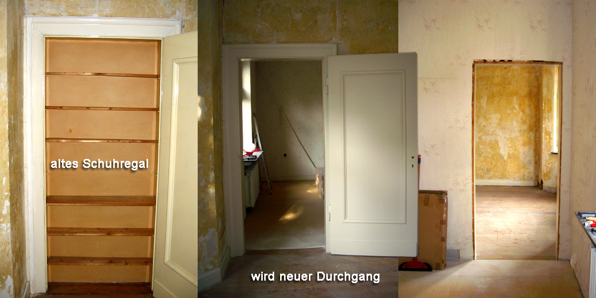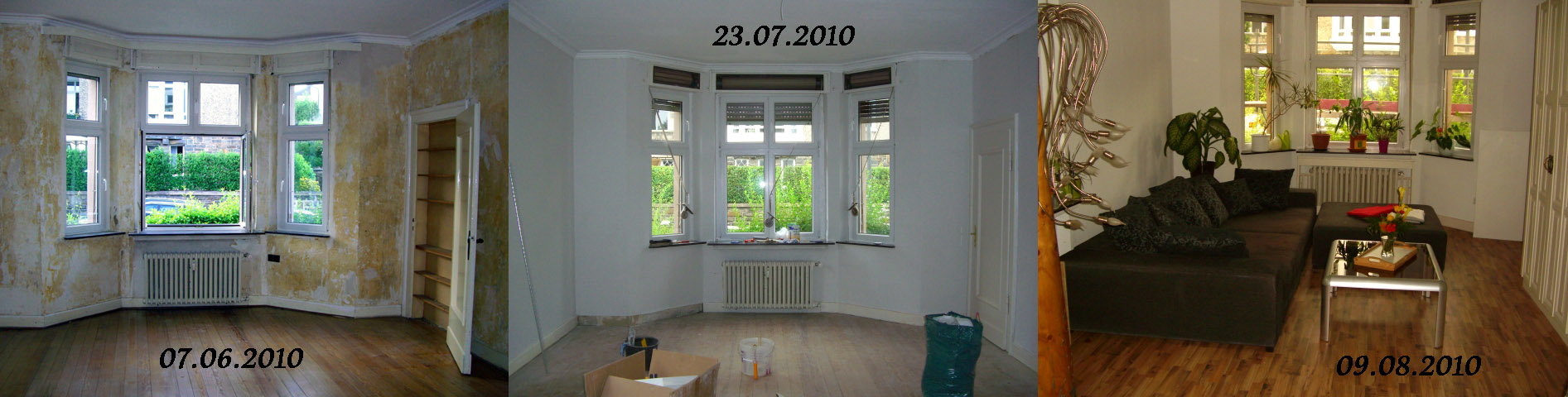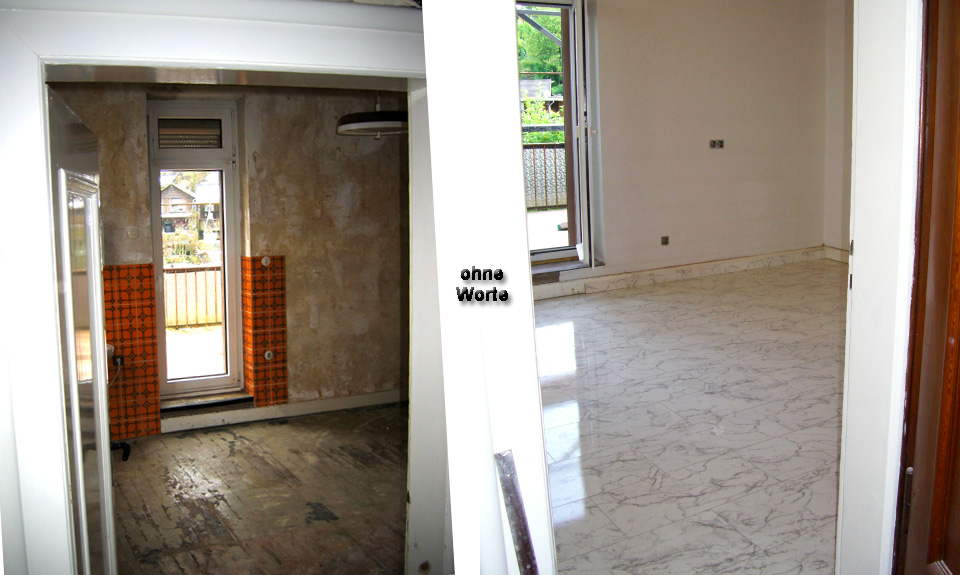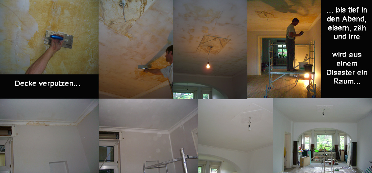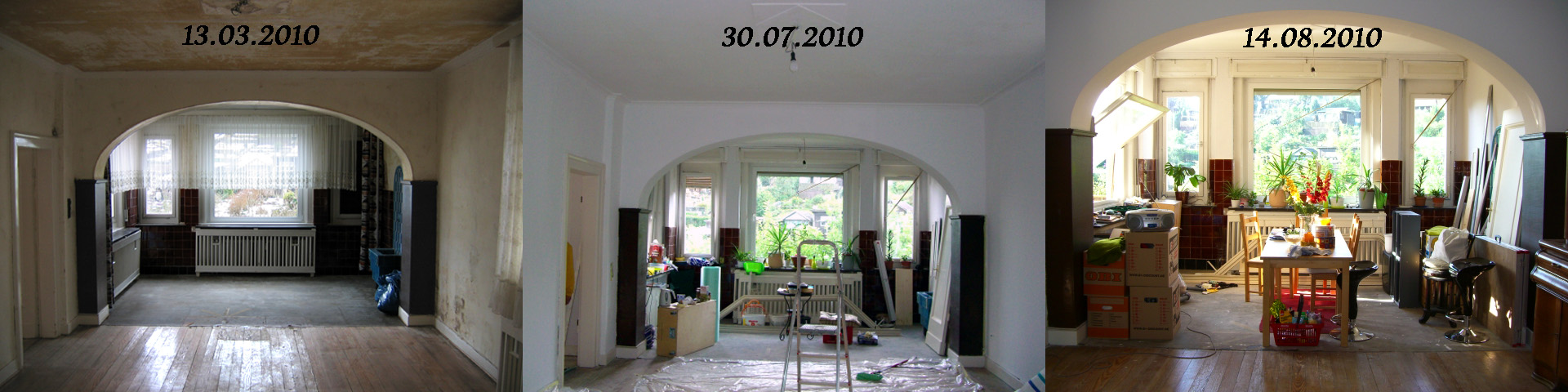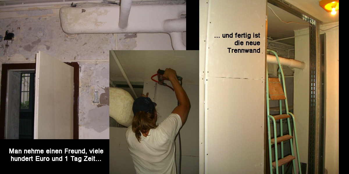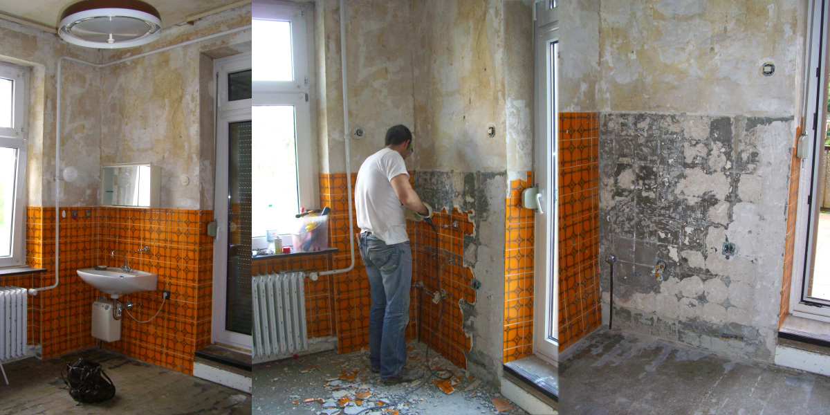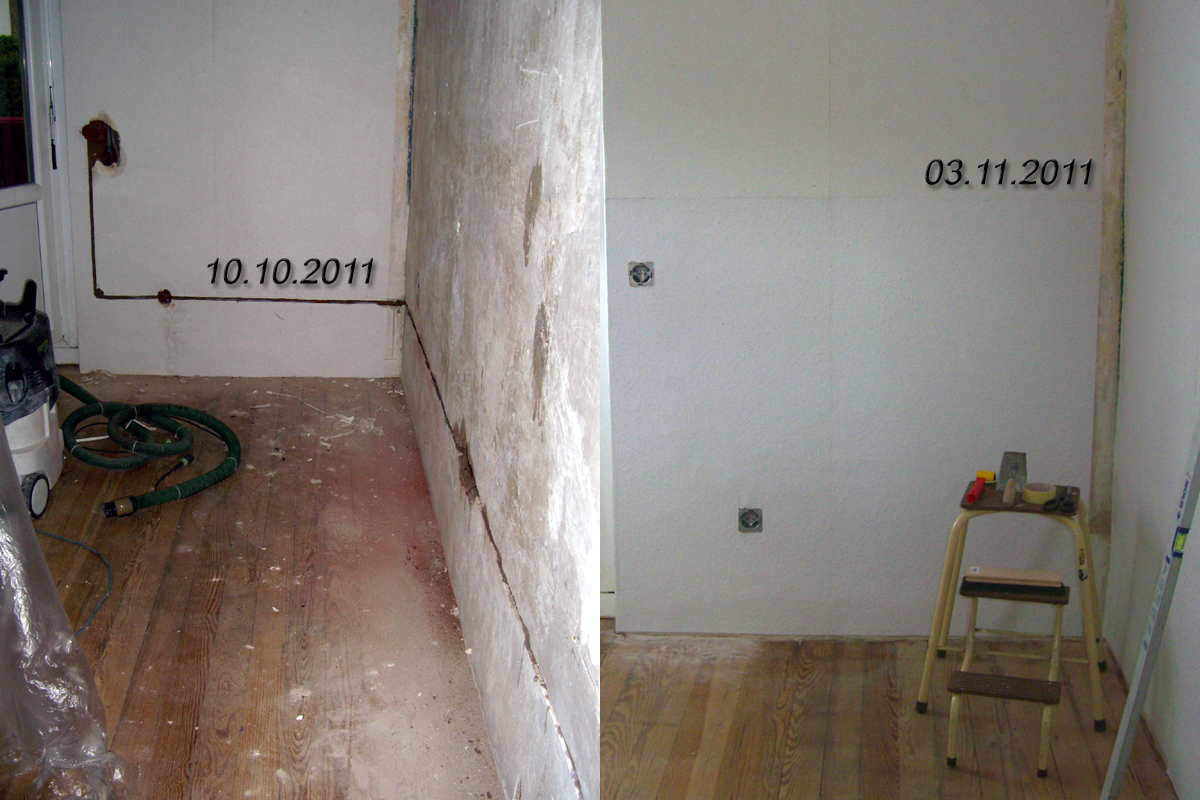 Noch eine Woche bis zum großen Umzug und wir haben immer noch einen riesigen Krater durch den Fußboden der Einliegerwohnung, keine Küchenanschlüsse, keinen Fliesenspiegel, die Wände sind teilweise nicht verputzt, kein einziger Boden ist verlegt, gestrichen ist bislang 1 Zimmer, kein Lack an Fußleisten, Schiebetür oder Türen im OG, die Zwischenwand im Keller hat keine Tür und ist unverputzt, um Sanitär-Tuning hat sich hier niemand gekümmert, im OG gibt’s kein warmes Wasser, das Badezimmer ist Baustelle, der Flur gleicht inzwischen dem Anblick eines Bombenangriffs – da müssen wohl doch noch alle Strom-Leitungen ausgetauscht werden – Brandgefahr! – und zu guter Letzt gehen uns langsam Energie und Finanzierungsmögilchkeiten aus. Bin wirklich mal gespannt, ob wir das bis nächste Woche schaffen.