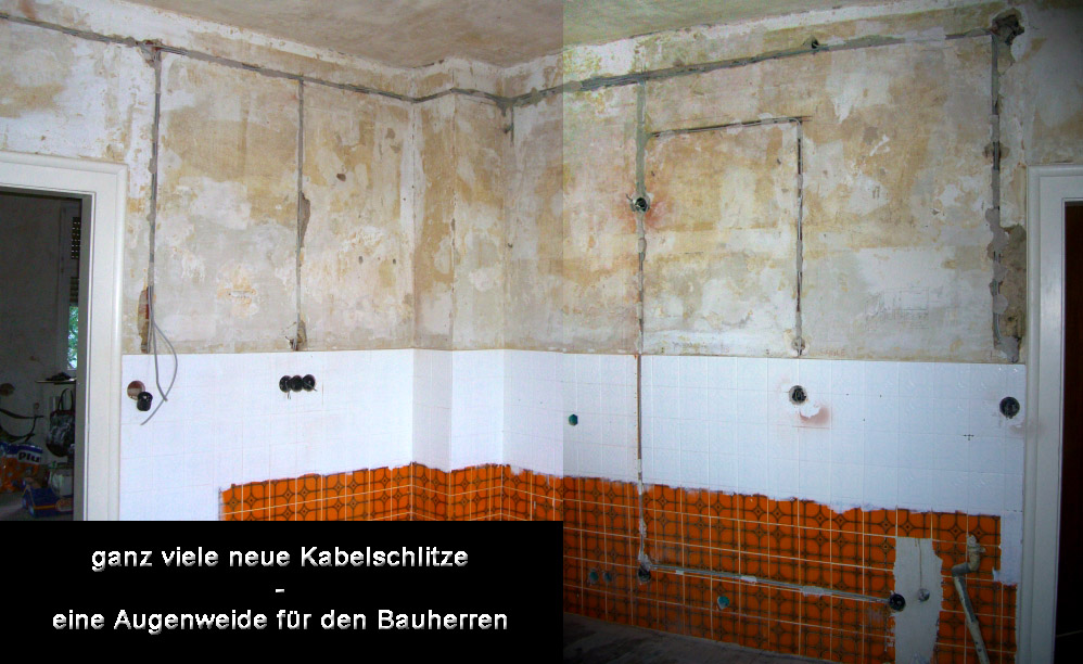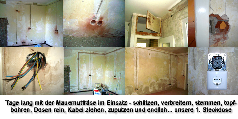 . Habe auch nur einen Schnitt am Zeigefinger von dem Spachtel, dessen Griff zum Schluss in der Mitte durchgerissen ist. Nachdem unsere Mauernutfräse kaputt gegangen ist und wir – Gott sei dank – ein Mietgerät leihen konnten, noch dazu einen Industriestaubsauger mitgenommen haben, wurden heute endlich die letzten Schlitze für den Elektriker gemacht
