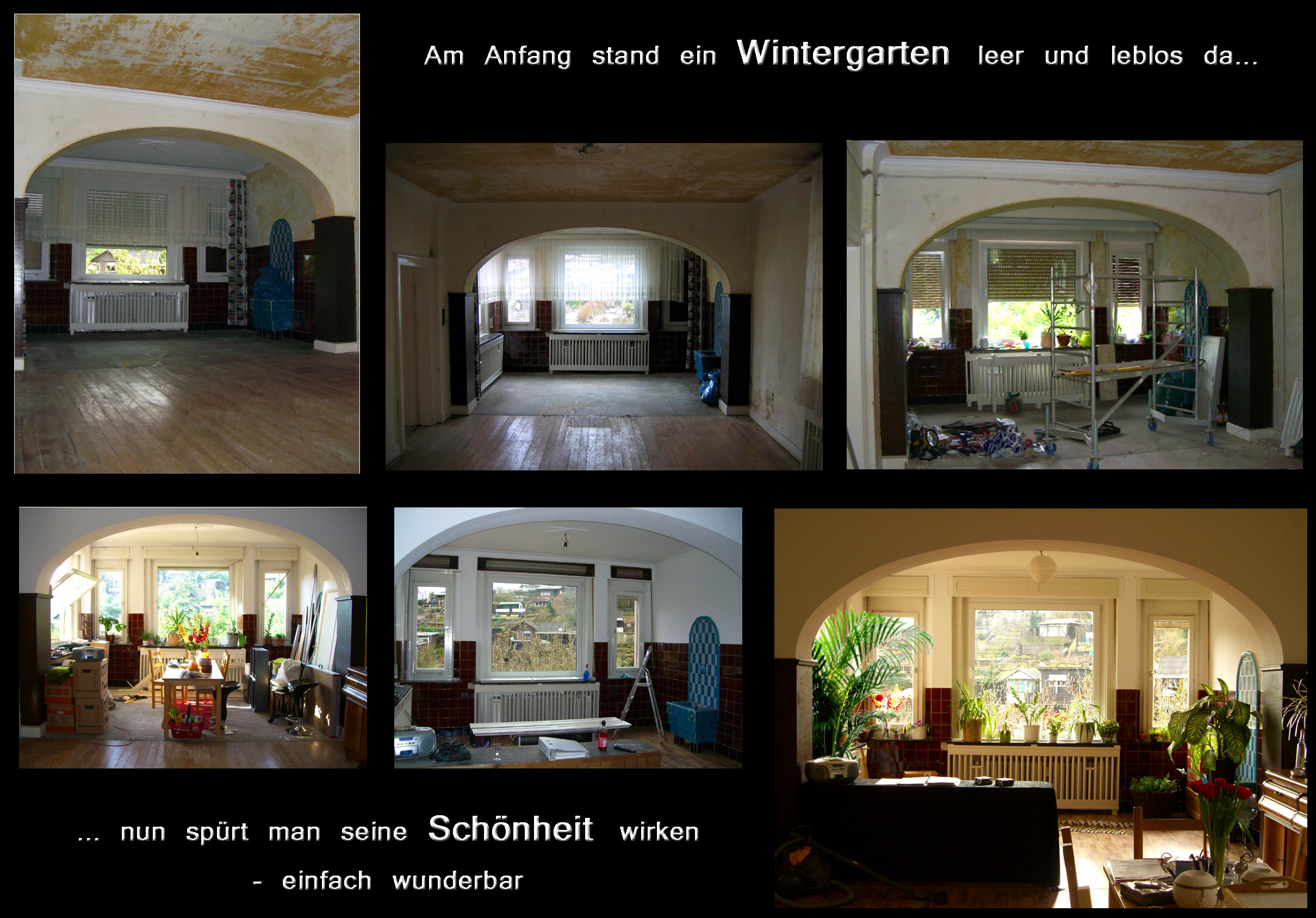 Halte ich mir doch nochmal die heilende Wirkung meines Hauses vor Augen. Sie liegt eindeutig in der fachgerechten Anwendung verschiedener häuslicher Vorzüge und der „Haus-haben-und-drin-wohnen-Beziehung“. Das Haus sorgt für meinen geschützten Rahmen, in dem ich mir mit seinen unzählbar vielen kleinen und großen Baustellen immer wieder ein unermüdliches Durchhaltevermögen aneignen kann und neue Selbsterfahrungen bzgl. eigener Überlebens- und Bewältigungsstrategien ermöglicht bekomme. Mein Haus ist manchmal anstrengend und schmerzhaft, kann aber dauerhafte positive Veränderungen in meinem Leben bewirken.